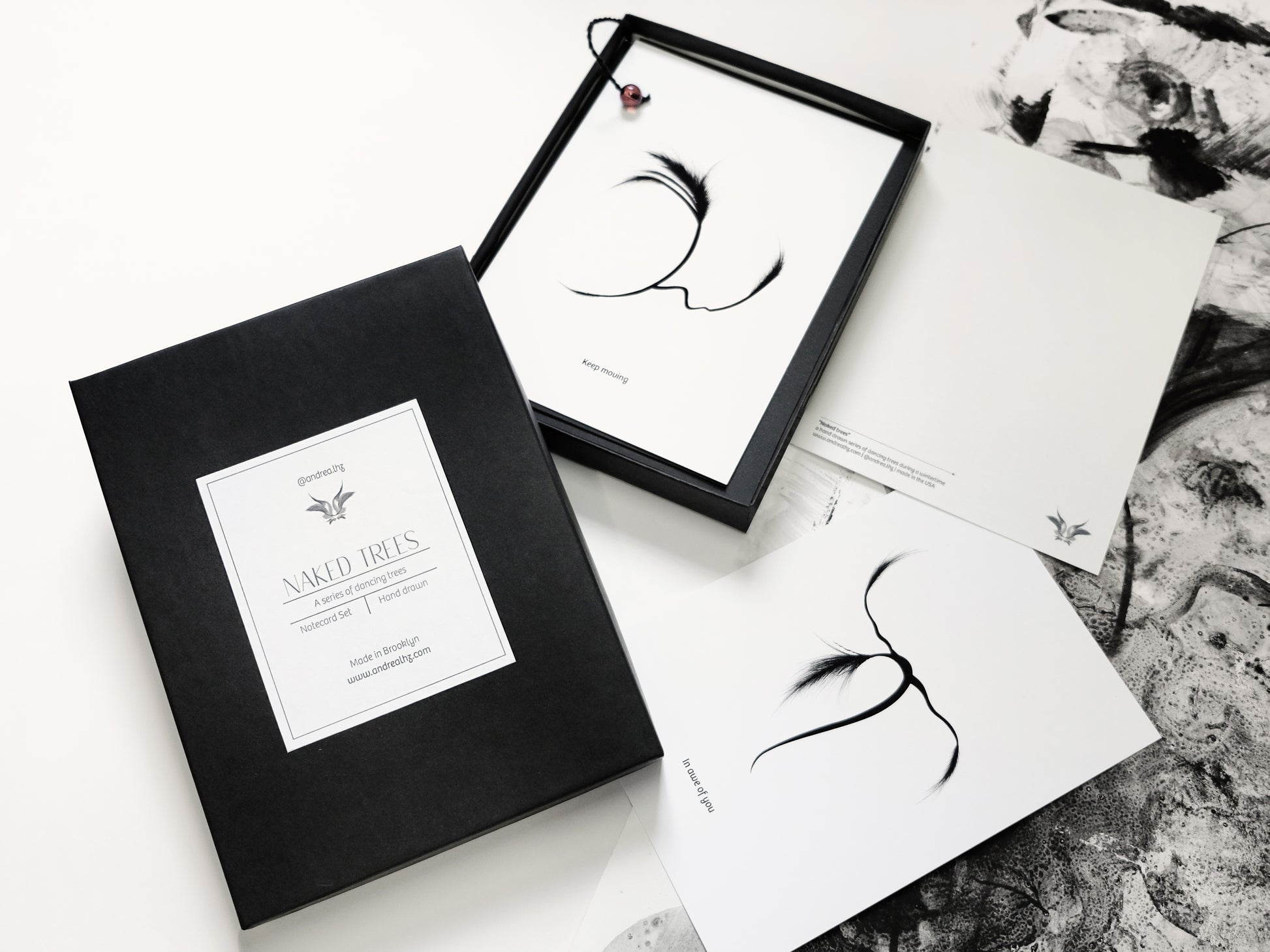 Notecard set contains all designs from Naked Trees series, accompanied by black envelopes.
