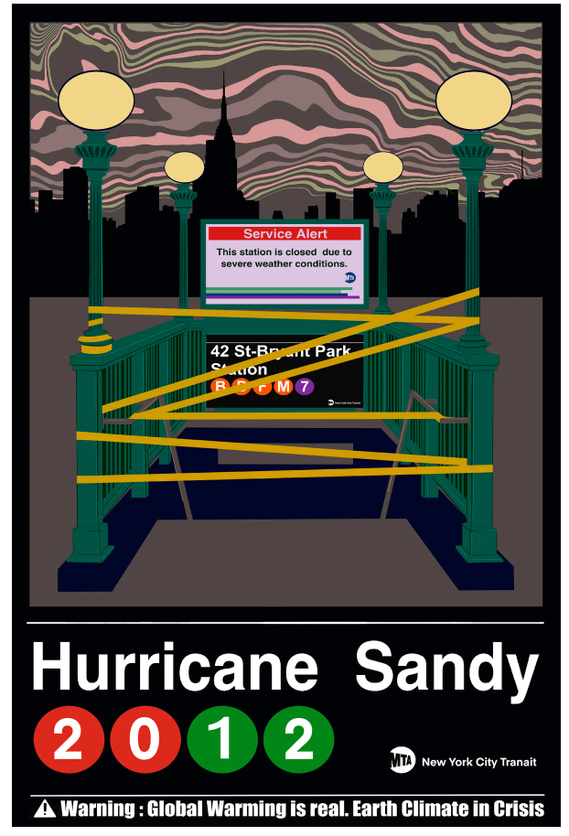 This poster, titled "Hurricane Sandy 2012," starkly illustrates the impact of the devastating storm on New York City. The imagery features a subway entrance at 42 St-Bryant Park, wrapped in caution tape and bearing a service alert that reads, "This station is closed due to severe weather conditions." The background shows swirling, ominous clouds in shades of brown and pink, symbolizing the chaotic and destructive nature of the hurricane. The use of familiar subway symbols and the NYC skyline anchors the scene in a specific place and time, underscoring the widespread disruption caused by the storm.