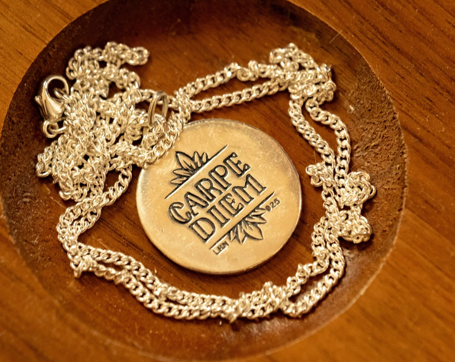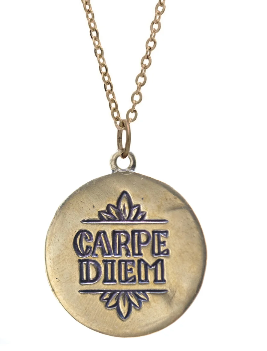 Carpe that Diem! Latin for "Seize the Day" this necklace features a hand engraved sunrise over the ocean with the words CARPE DIEM carved into the back. Wear this as a daily reminder to live in the present, enjoy the moment, and don't dwell — for every day is a brand new chance to make things happen! Hand engraved, this necklace is classic in design and style, and perfectly adorns everybody.